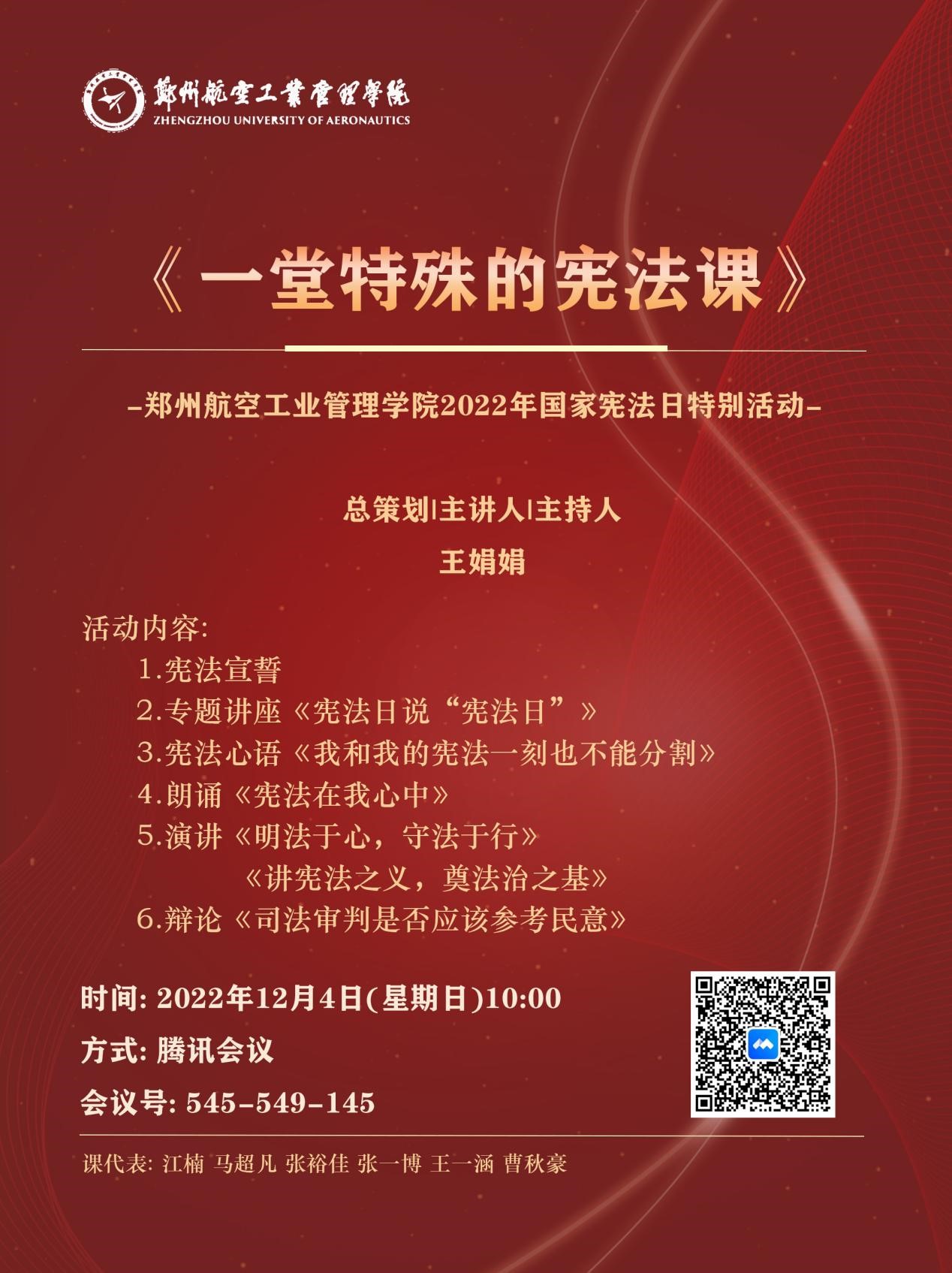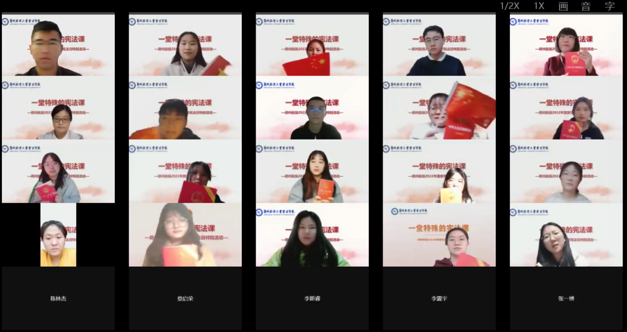 2022年12月4日,是我国第九个宪法日,恰逢《中华人民共和国宪法》颁布实施40周年。今年宪法日的主题是“学习宣传贯彻党的二十大精神,推动全面贯彻实施宪法”。为学习宣传党中央全面依法治国、推进法治中国建设的重大部署,学习宣传贯彻党的二十大精神,我校积极响应国家号召,于12月4日上午组织在线开展“一堂特殊的宪法课”特别活动。