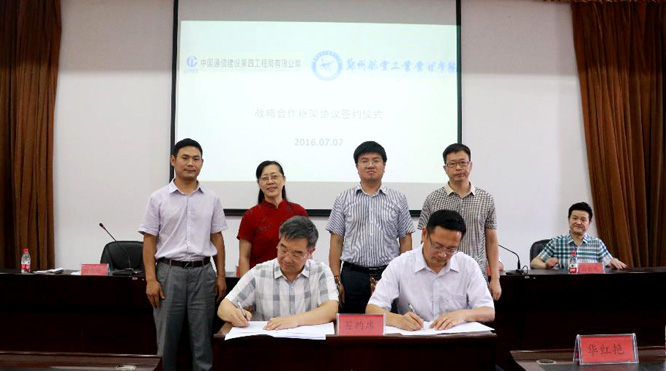 7月7日,我校与河南北斗卫星导航平台有限公司、中国通信建设第四工程局有限公司战略合作框架协议签约仪式在学校第二会议室隆重举行。副院长贺金社、河南北斗卫星导航平台有限公司董事长胡建立、总经理白金发、中国通信建设第四工程局有限公司技术总监李书森和两家企业技术骨干、我校师生代表出席此次签约仪式。签约仪式由电子通信工程学院院长刘兆瑜主持。