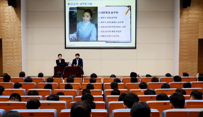 会见结束后,灵山大学航空旅游系主任朴智贤教授为我校民航学院空乘专业的学生做了题为“韩国空中乘务行业现状及发展趋势”的主题报告,报告由民航学院院长石英主持。朴智贤在报告中从5个方面详细介绍了空乘专业的发展趋势,空乘人员应具备的素质等,并与现场学生进行了热烈的互动,授课效果良好,受到学生的欢迎。