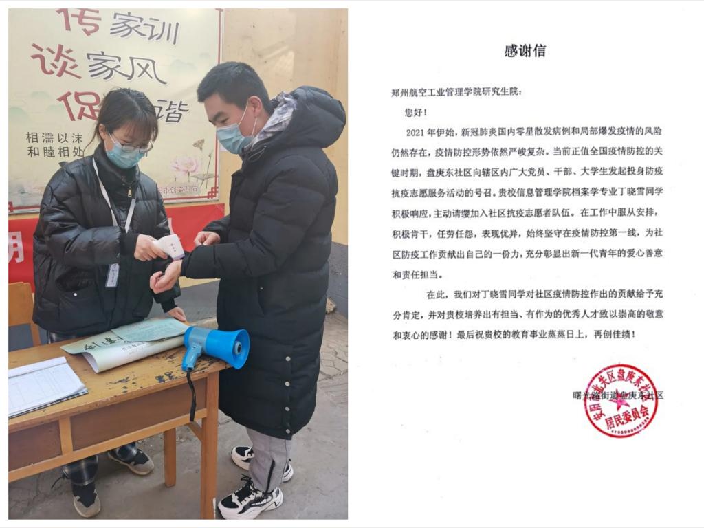 丁晓雪坚守岗位期间的表现得到安阳市曙光街道盘庚东社区和领导们的广泛认可。曙光街道盘庚东社区特别致信肯定丁晓雪同学的任劳任怨、积极肯干、勇于担当,对我校培养出像丁晓雪一样的优秀青年表达感谢。社区书记巫丽萍说:“丁晓雪同学积极响应号召参加疫情防控,在寒冷的户外始终坚守在社区防控第一线,不怕苦不怕累,表现十分不错,以实际行动诠释出当代青年的责任与担当。”
